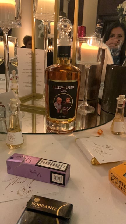 Vesela atmosfera, potrajala je do duboko u noć, a jedan detalj posebno je privukao pažnju prisutnim gostima, koji su bili deo svadbenog veselja. Na stolovima mogla se videti "kumova rakija", koja je na sebi imala sliku Šabana Šaulića i njegovog najboljeg prijatelja.