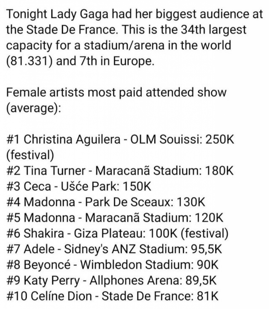 Naime, Lejdi Gaga nedavno je održala spektakl u Parizu na kojem je prisustvovalo više od 80.000 ljudi, što je izazvalo mnoštvo reakcija muzičkih stručnjaka. Taj koncert je sedmi na listi najposećenijih u Evropi, a na 34. mestu svetske liste najposećenijih koncerata ženskih vokala svih vremena.