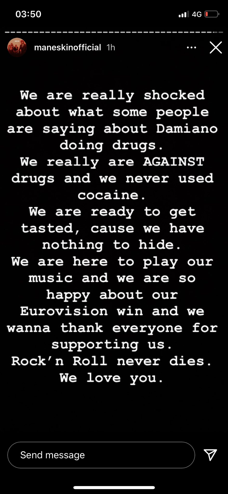 - Zaista smo šokirani time što pojedini ljudi govore da je Damijan koristio drogu. Mi smo protiv droge i nikada nismo koristili kokain. Spremni smo da se testiramo jer nemamo šta da krijemo. Mi smo ovde da predstavimo našu muziku i veoma smo srećni zbog naše pobede na Evroviziji, i želimo da se zahvalimo svima na podršci. Rokenrol nikad ne umire. Volimo vas - navodi se u objavi grupe "Maneskin".