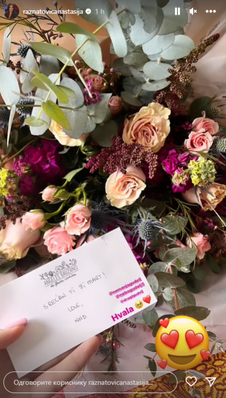 Kako se vidi na Instagram storiju, Ražnatovićevu je Gudelj obradovao buketom cveća,a potom je pokazala i čestitku: