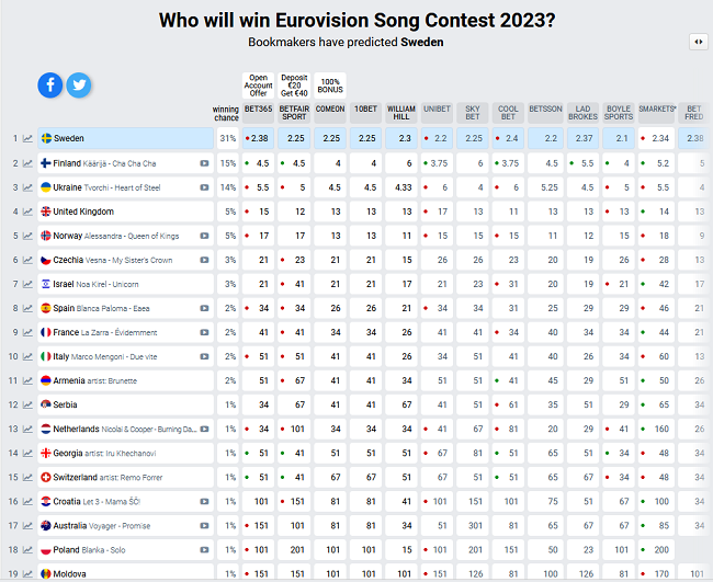 Kladionice sada tipuju da će šampion biti Švedska, koja u narednim danima bira svog predstavnika.