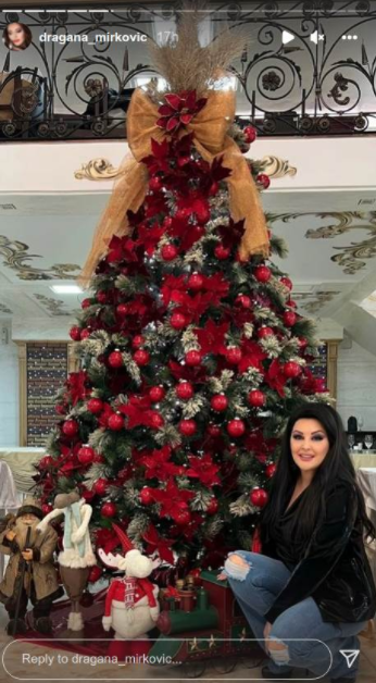 Dragana je pozirala ispred kamina koji je ukrašen crvenom dekoracijom sa zlatnim ukrasima, a potom je objavila i fotografiju pored ogromne raskošne jelke koja je takođe u istom tonu.