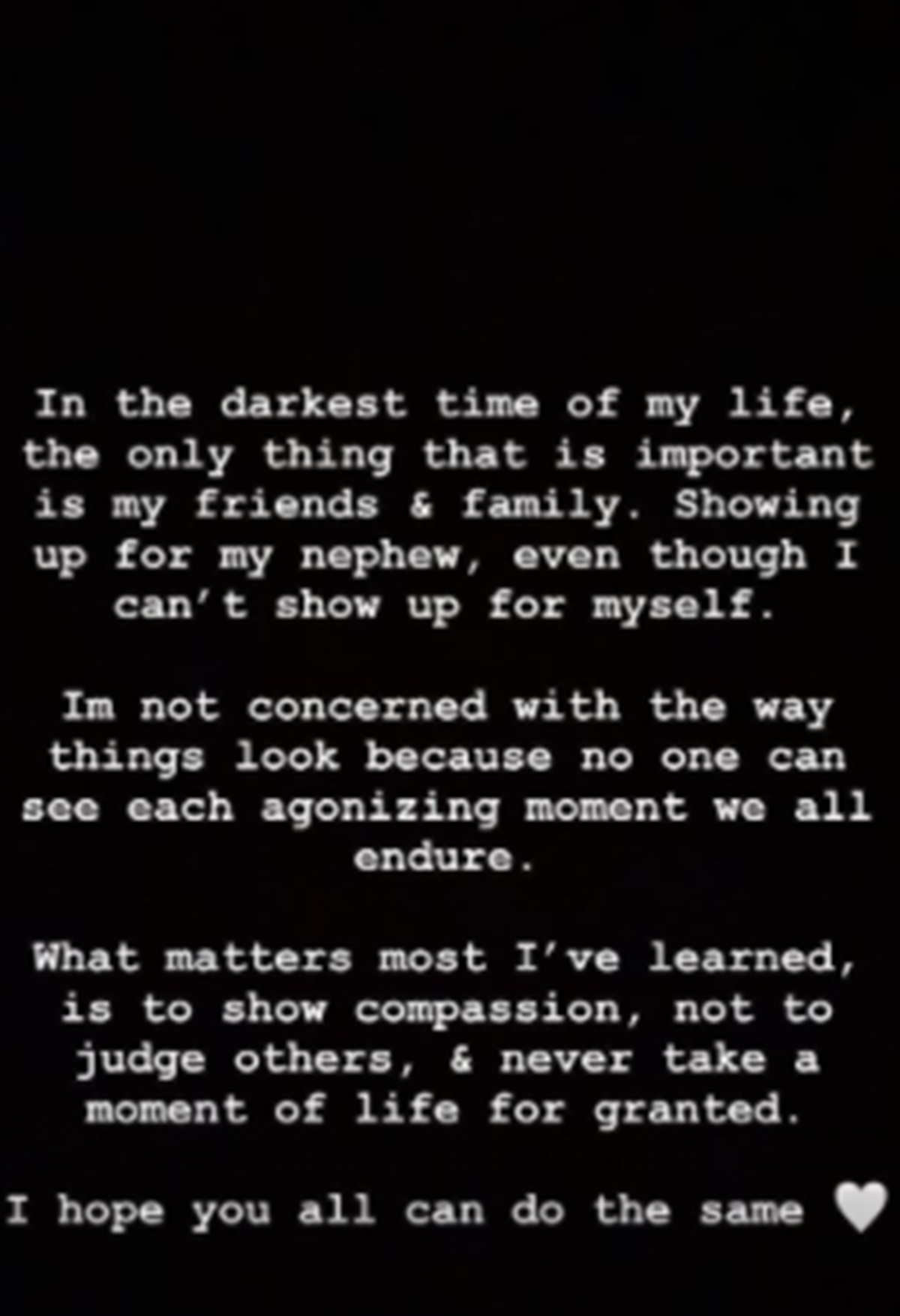 - U najmračnijem vremenu moga života jedino što je važno su moji prijatelji i porodica. Biti tu za svog nećaka, iako ne mogu ni za sebe. Ne zanima me kako stvari izgledaju jer niko ne može da vidi teške trenutke kroz koje svi prolazimo.