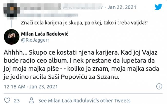 - Ah! Skupo će koštati njena karijera. Kad joj Vajaž bude radio ceo album. I nek prestane da lupetara da joj moja majka piše. Koliko ja znam, moja majka sada je jedino radila Saši Popoviću za Suzanu - dodao je on.