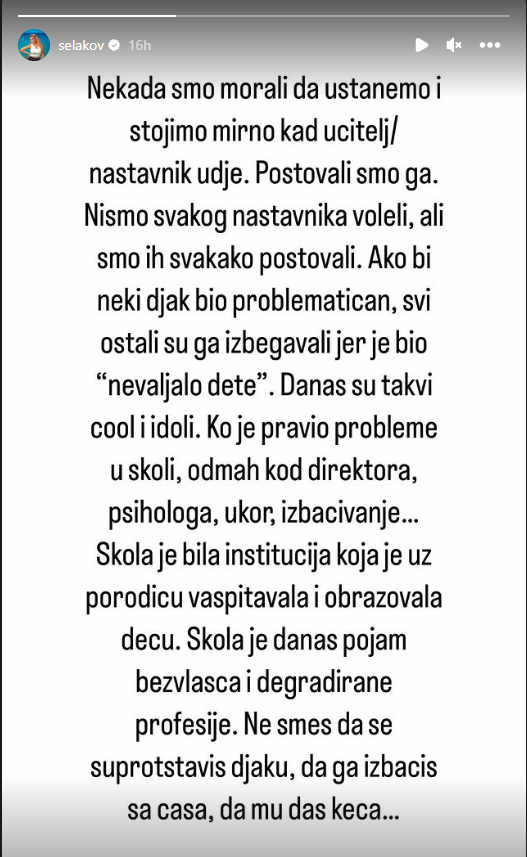 - Nekako smo morali da ustanemo i stojimo mirno kad učitelj, nastavnik uđe. Poštovali smo ga. Nismo svalog nastavnika voleli, ali smo ih svakakoo poštovali. Ako bi neki đak bio problematičan svi ostali su ga izbegavali jer je bio „nevaljalo dete“. Danas su takvi kul i idoli. Ko je pravio probleme odmah je išao kod direktora, psihologa, ukor, izbacivanje. Škola je bila institucija koja je uz porodicu vaspitavala i obrazovala decu. Danas je škola pojam bezvlašća i degradirane profesije. Ne smeš da se suprotstaviš đaku, da ga izbaciš sa časa, da mu daš keca - napisala je u objavi.