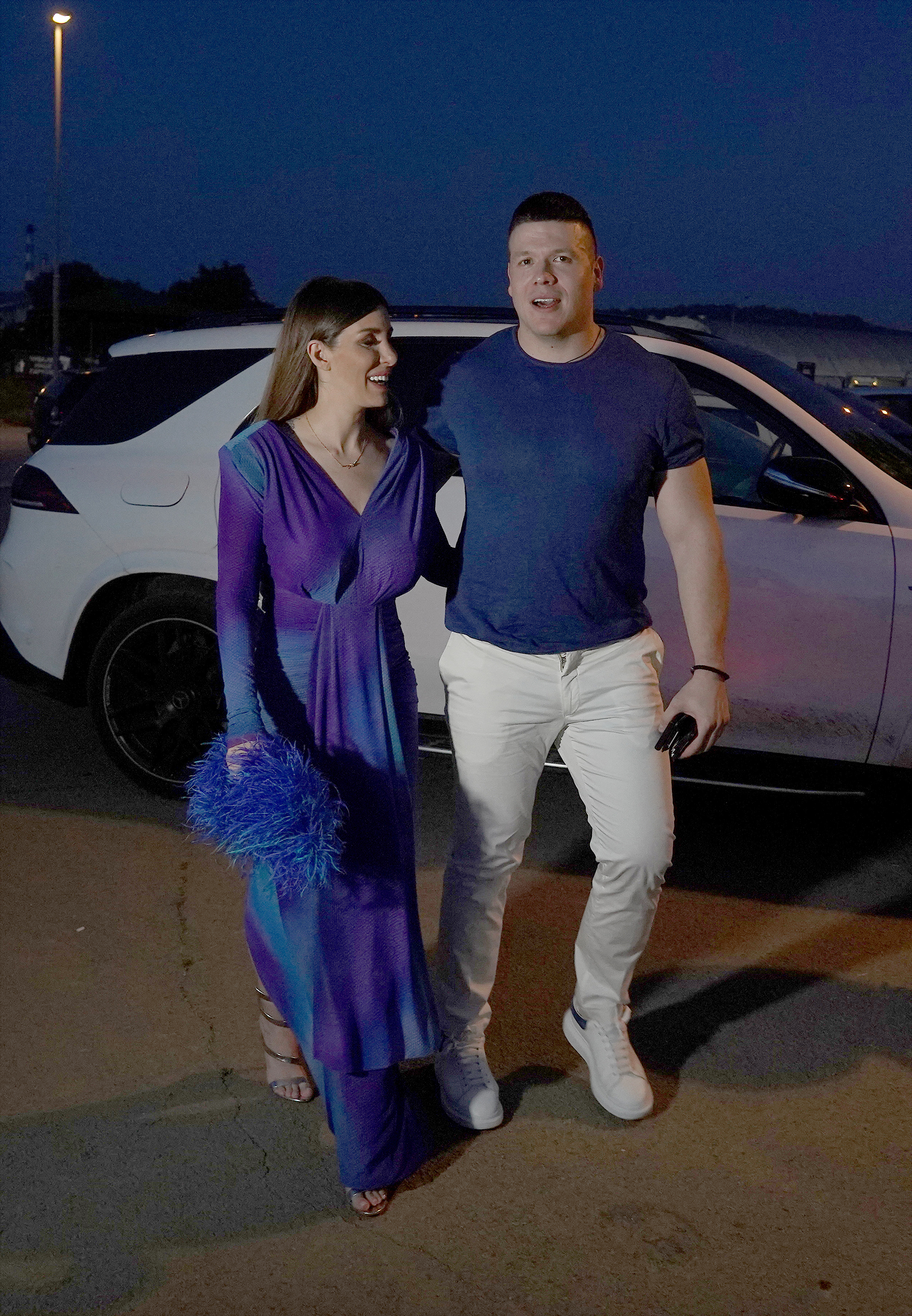 Poznati pevač pristigao je u pratnji supruge Jelene, koja se odlučila za haljinu u ljubičasto-plavim tonovima. Odevna kombinacija istakla je njenu vitku figuru, koju je posle porođaja vratila u rekodnom roku.