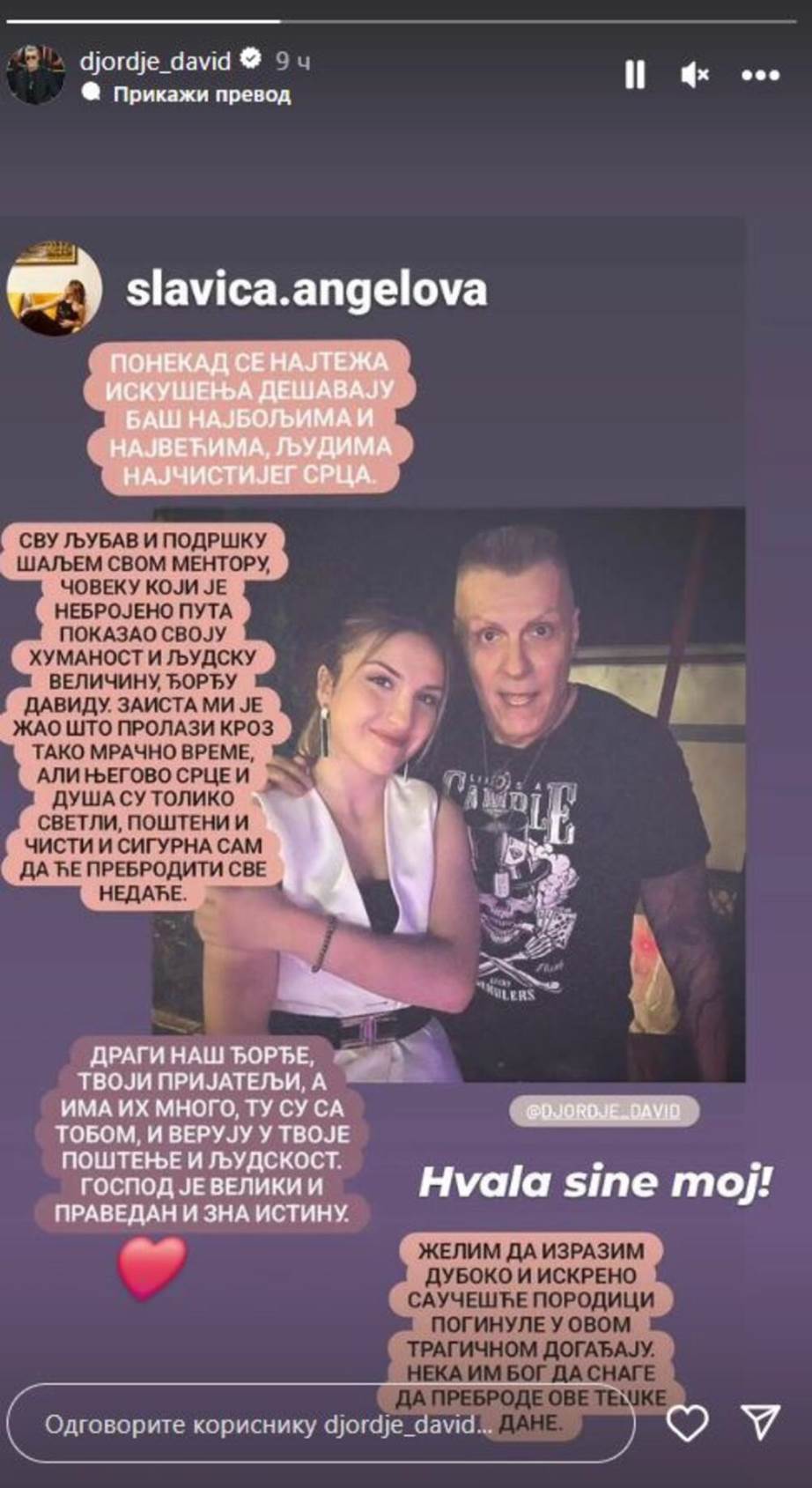 - Svu ljubav i podršku šaljem svom mentoru, čoveku koji je nebrojeno puta pokazao svoju humanost i ljudsku veličinu. Zaista mi je žao što prolazi kroz tako mračno vreme, ali njegovo srce i duša su toliko pošteni. Želim da izjavim saučešće porodici poginule u ovom tragičnom događaju. Neka im Bog da snage da prebrode ove teške dane - piše u objavi, a Đorđe joj se zahvalio: "Hvala, sine moj".