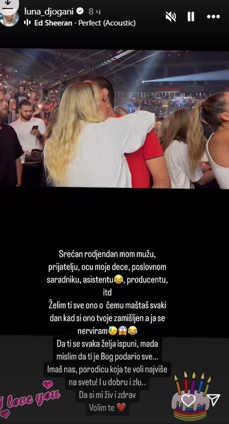 - Srećan rođendan, mužu moj, prijatelju, ocu moje dece, poslovnom saradniku, asistentu, producentu... Želim ti sve ono čemu maštaš svaki dan kad si ono tvoje zamišljen, a ja se nerviram. Da ti se svaka želja ispuni, mada mislim da ti je Bog podario sve... Imaš nas, porodicu koja te voli najviše na svetu. I u dobru i u zlu. Da si živ i zdrav. Volim te - napisala je Luna uz emotivni video.