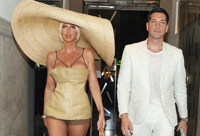 Sva u bež-braon tonovima, Jelena je nosila minijaturni šorts, a u gornjem delu je imala neobičan korset ispod kog su se nazirale bretele crne boje, koje su išle preko grudi.