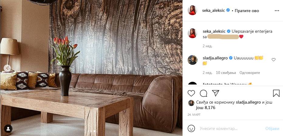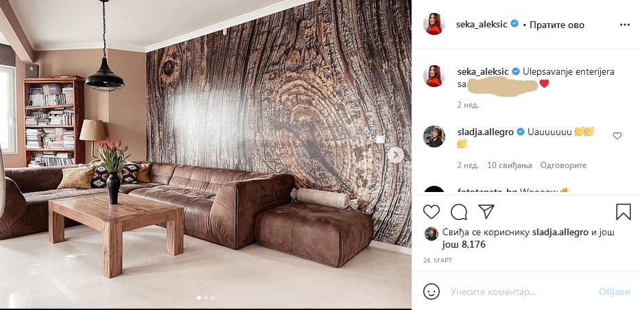 Jednu kompletnu stranu zida prekrila je tapetom, koja je unela potpuno novi luk u njen dom. Da se promena sviđa i njenim prijateljima, svedoči i komentar Slađe Alegro, Sekine dobre prijateljice, koja je oduševljena novim izgledom prostora.