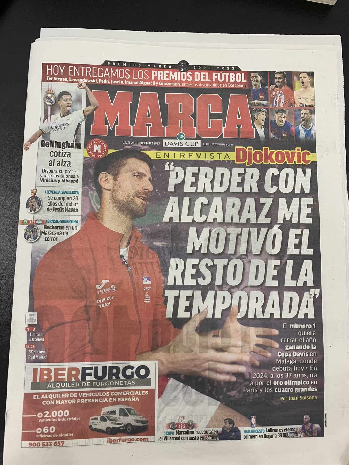 Novak Đoković koji je po sedmi put pobedio u ATP finalu u Torinu, debituje danas u četvrtfinalu Dejvis kupa protiv Kamerona Norija. Ekipa "Večernjih novosti" je stigla jutros u Španiju, a naš specijalni izveštač, Nemanja Rašić sa "Nportal.rs", prenosi nam delić atmosfere pred finalni turnir Dejvis kupa koji se održava u Malagi. Srbja danas irga prvi meč protiv Velike Britanije, a cela nacija se nada pozitivnom ishodu. Najpoznatiji španski sportski list "Marka" je danas objavio intervju sa našim teniserom u kom je on, između ostalog, otkrio i zbog čega svaki dan prelazi oko 150 kilometara i zašto nije sa ostatkom tima.