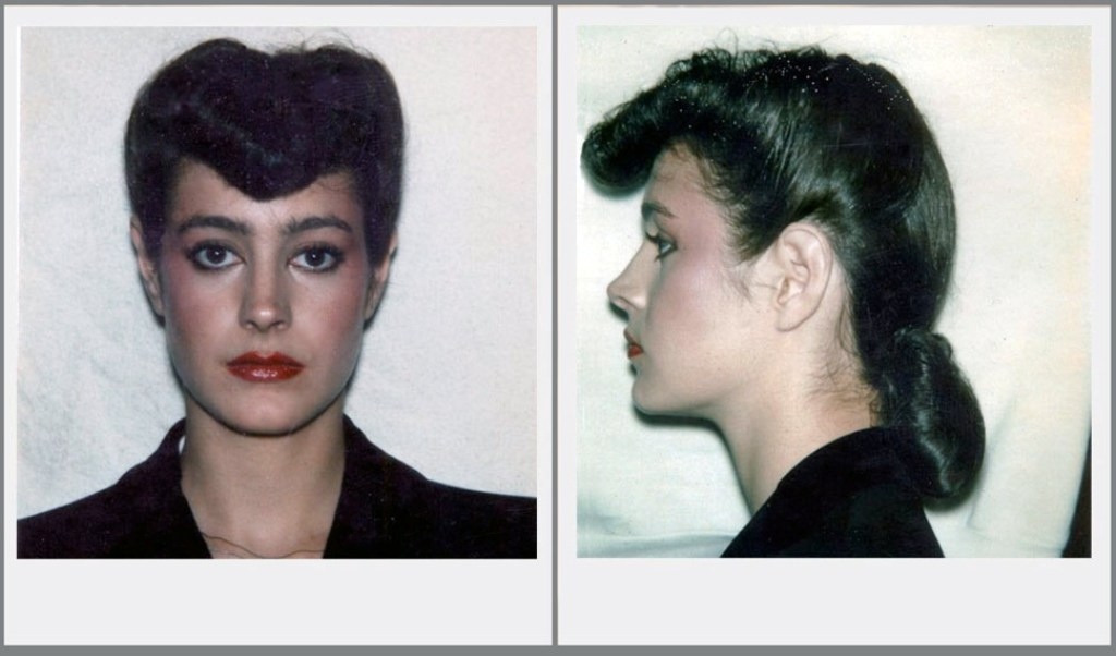 Tamna kosa i neobična frizura, ramena naglašena naramenicama i misteriozna aura učinili su je nezaboravnom figurom retrofuturističkog Holivuda.