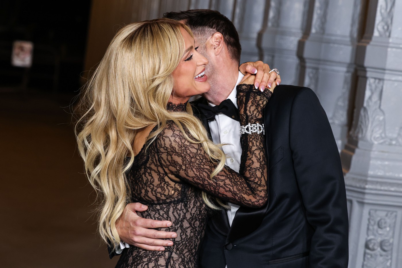 Fotografije prikazuju Reuma, obučenog u potpuno belo odelo i crne mokasine, kako kleči na jednom kolenu dok pruža prsten u ružičastoj kutiji svojoj supruzi Hilton, koja je za tu priliku nosila belu haljinu u grčkom stilu sa dugačkim, lepršavim rukavima.