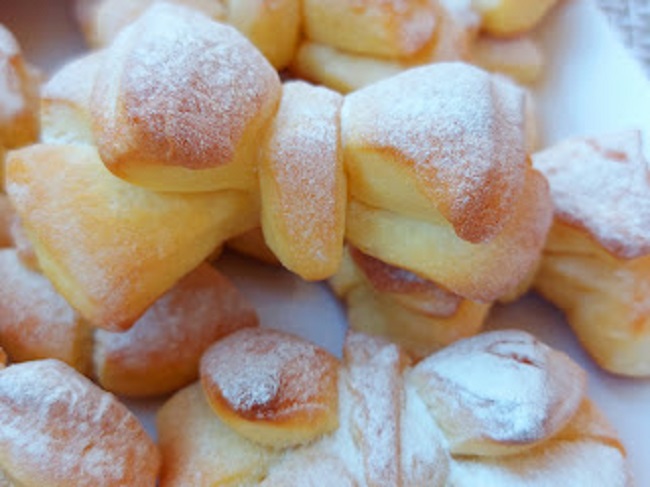 - Peći na 180 stepeni 30 minuta. Posuti vanilinim šećerom u prahu. Fantastične male mašnice, hrskave unutra testo kao pena.