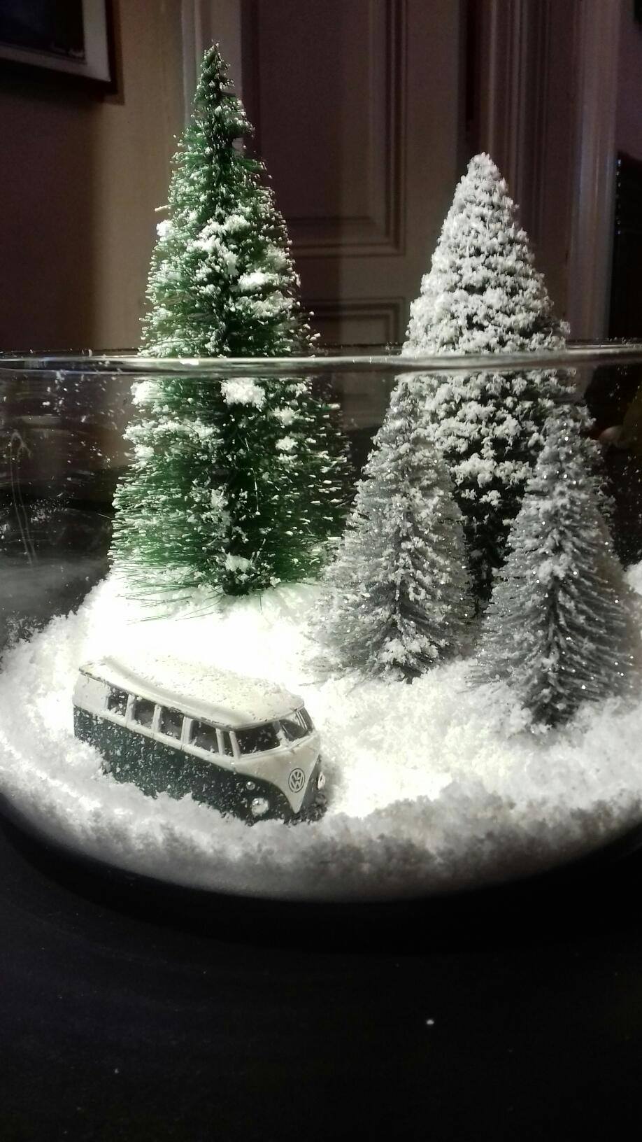 Kada se tegla osuši napuni se veštačkim snegom, ubaci se šišarka i jedan lampion. Oko tegle se obmota pantljika ili običan kanap. Ukras je gotov. U ovako ukrašenu teglu možete dodati sveću koja će uveče lepo sijati.