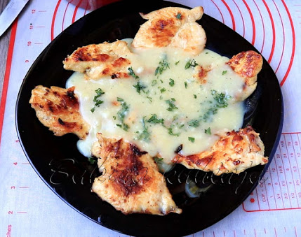 Isključiti pa dodati soli, bibera, soja sosa i peršunovog lista. Šnicle poređati u tanjir i preliti sosom.