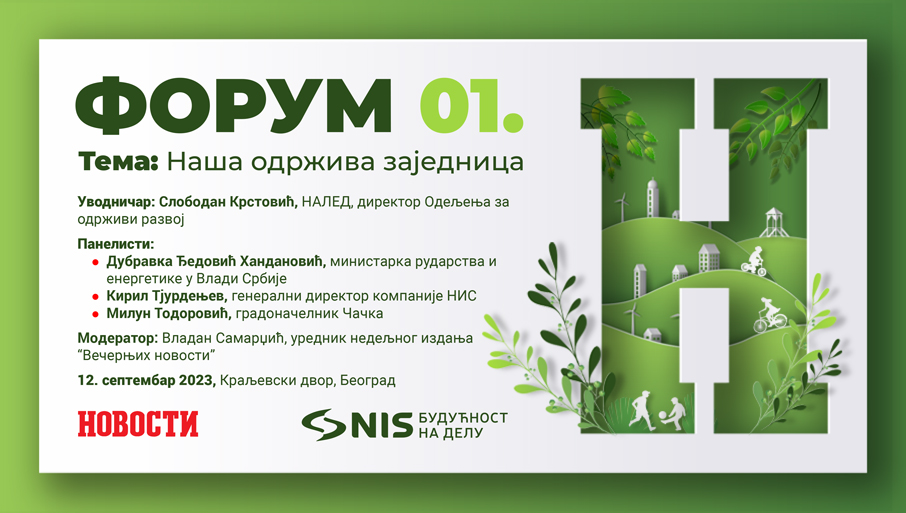 Podsetimo, sa željom da doprinese razvoju ljudskih i očuvanju prirodnih resursa, kao i unapređenju kvaliteta života svih naših sugrađana, kompanija "Novosti" 12. septembra 2023. godine organizuje Forum 01 na kom će se razgovarati o tome kako da našu zajednicu učinimo inkluzivnijom, bezbednijom i omogućimo joj dugoročni održivi razvoj. Ova diskusija inspirisana je Ciljevima održivog razvoja UN koji predstavljaju globalni poziv na akciju kako bi se iskorenilo siromaštvo, zaštitila životna sredina i usporile klimatske promene, te osiguralo da svi ljudi žive u miru i prosperitetu, uz dostojanstvene uslove za rad, obrazovanje i ekonomski rast.