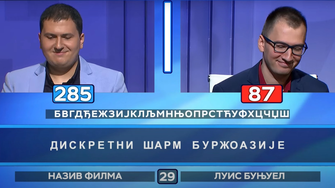 Osvojio je 29 poena zahvaljujući rešenju: "Diskretni šarm buržoazije" i igru završio sa 285 bodova.