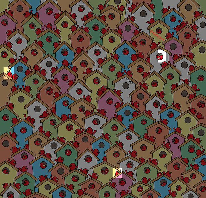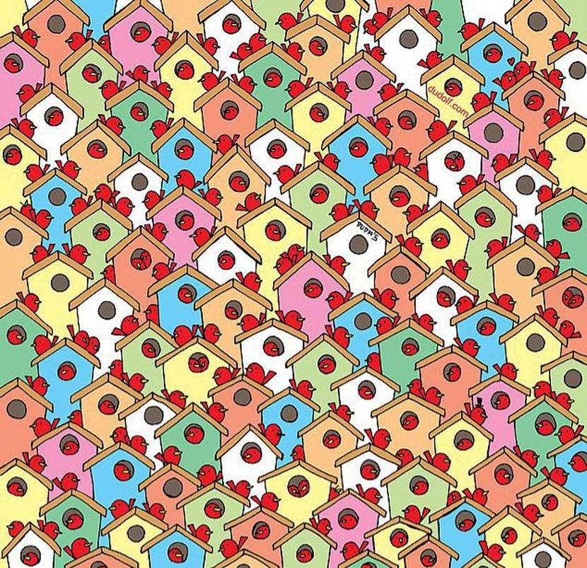 Naime, sada je nacrtao kućice, crvene ptičice i tri skrivena predmeta. Prema rečima umetnika, na ilustraciji se nalaze tri crvene jabuke koje nije lako uočiti, s obzirom na to da su i ptice i jabuke iste boje.