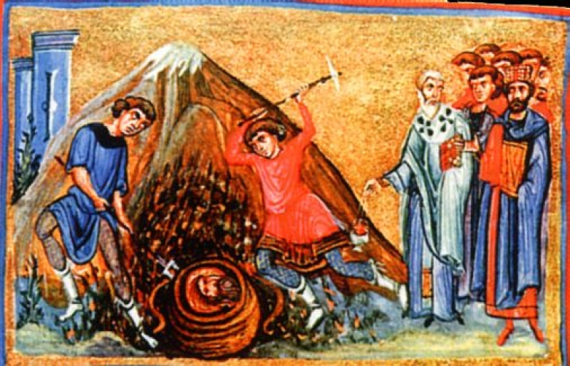 Prema predanju, veliki i slavni prorok Jovan Krstitelj bi posečen po želji i nagovoru zlobne Irodijade, žene Irodove. Kada Jovan bi posečen, naredi Irodijada da mu se glava ne sahranjuje zajedno sa telom, jer se bojaše da strašni prorok nekako ne vaskrsne. Stoga uze njegovu glavu i zakopa je na nekom skrivenom i beščesnom mestu, duboko u zemlju. NJena dvorkinja beše Jovana, žena Huze, dvorjanina Irodova. Dobra i blagočestiva Jovana ne mogaše trpeti da glava Božjega čoveka ostane na mestu beščesnome, iskopa je tajno, odnese u Jerusalim i sahrani na Gori Jeleonskoj. Ne znajući o svemu tome, car Irod kada dozna o Isusu kako čini velika čudesa, uplaši se i reče: „To je Jovan koga sam ja posjekao, on ustade iz mrtvih“ (Mk 6, 16). Posle izvesnog vremena neki znamenit vlastelin poverovavši u Hrista, ostavi položaj i sujetu svetsku i zamonaši se, i kao monah, s imenom Inokentije, nastani se na Gori Jeleonskoj baš na onom mestu gde je glava Krstiteljeva bila zakopana. Želeći da zida sebi ćeliju, on kopaše duboko i nađe zemljan sud i u njemu glavu, za koju mu se javi tajanstveno, da je Krstiteljeva. On je celiva i zakopa na tom istom mestu.
