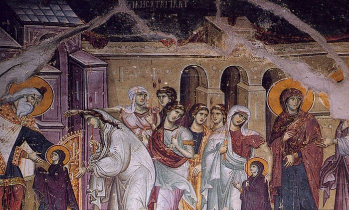 Na ulazu u hram, Mariju je dočekao prvosveštenik Zaharija, otac Svetog Jovana Preteče i Krstitelja i uveo je u svetinju, gde je bila do svoje 12 godine.
