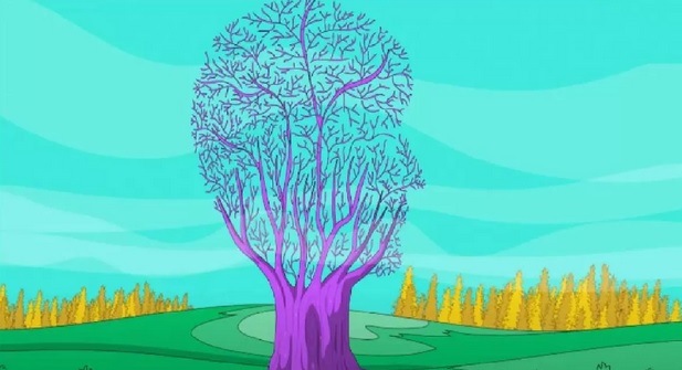 Slika prikazuje lepo i neobično drvo. Celokupan pejzaž je prilično neobičan. Ima zelenu pozadinu na kojoj je trava sa žutim drvećem koje se vidi iz daljine. Drvo koje vidite je neobično jer ima ljubičsto stablo. Ipak, nekima može da se učini i da vide lice.