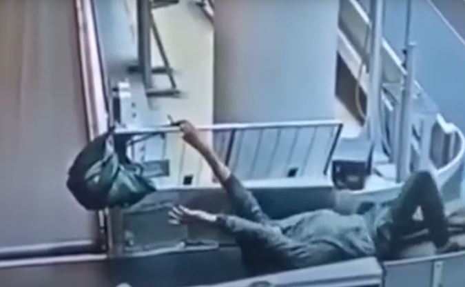 Na snimku se vidi kako hoda trakom sa ručnim prtljagom, a onda gubi ravnotežu i pada na traku, dok mu se ranac zaglavio na ogradi sa strane.