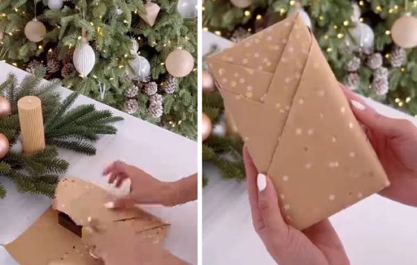 Potrebno vam je samo dve stvari: ukrasni papir i dva parčeta selotejpa. Uzmite oko tri puta više papira nego što je širina poklona, presavijte širi deo naviše, ivice presavijte i prebacite preko poklona, najpre kraće, a zatim duže delove, zalepite sa strane, a zatim donji kraj presavijte i zalepite.