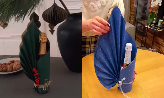 Naime, potrebno je samo da deo ukrasnog papira ispresavijate kao kada pravite lepezu, a ostatak iskoristite za umotavanje flaše. Ispratite snimke koji detaljno objašnjavaju kako da upakujete flašu i uživajte u prazničnom raspoloženju.