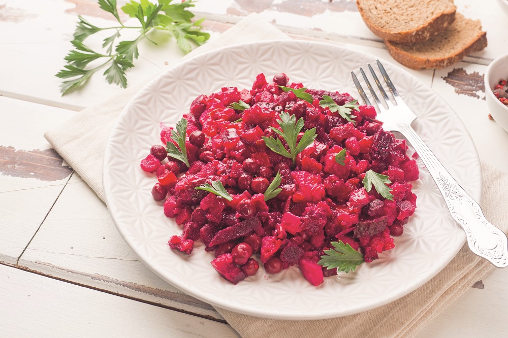 Večera: barena cvekla začinjena sa uljem i belim lukom i porcija belog pilećeg mesa sa žara