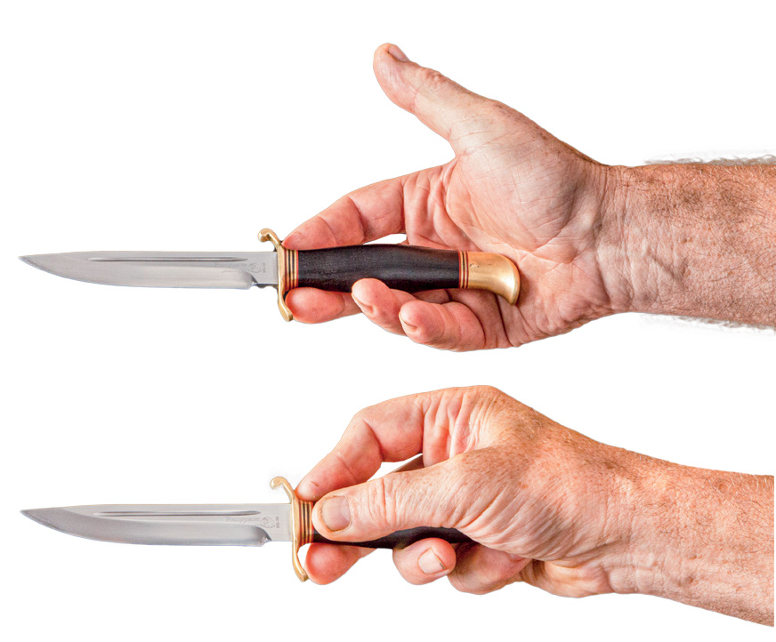 Uobičajen položaj noža u šaci. Ovakav hvat je omogućavao vrlo snažne ubode, zahvaljujući dlanu koji je gurao sečivo prema napred, foto: Ninoslav Trifunović