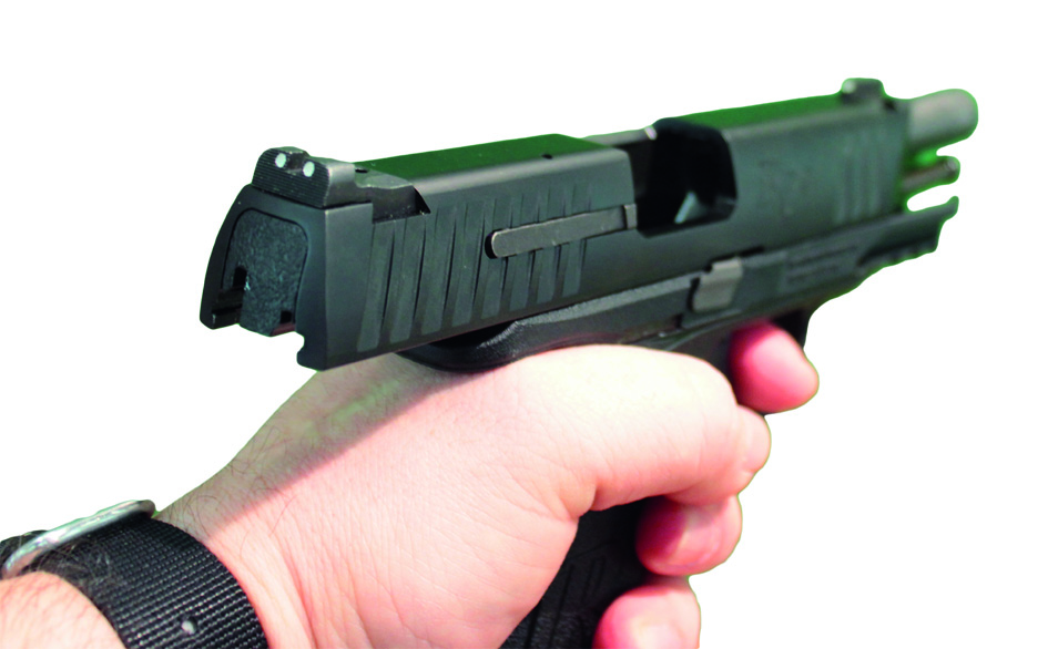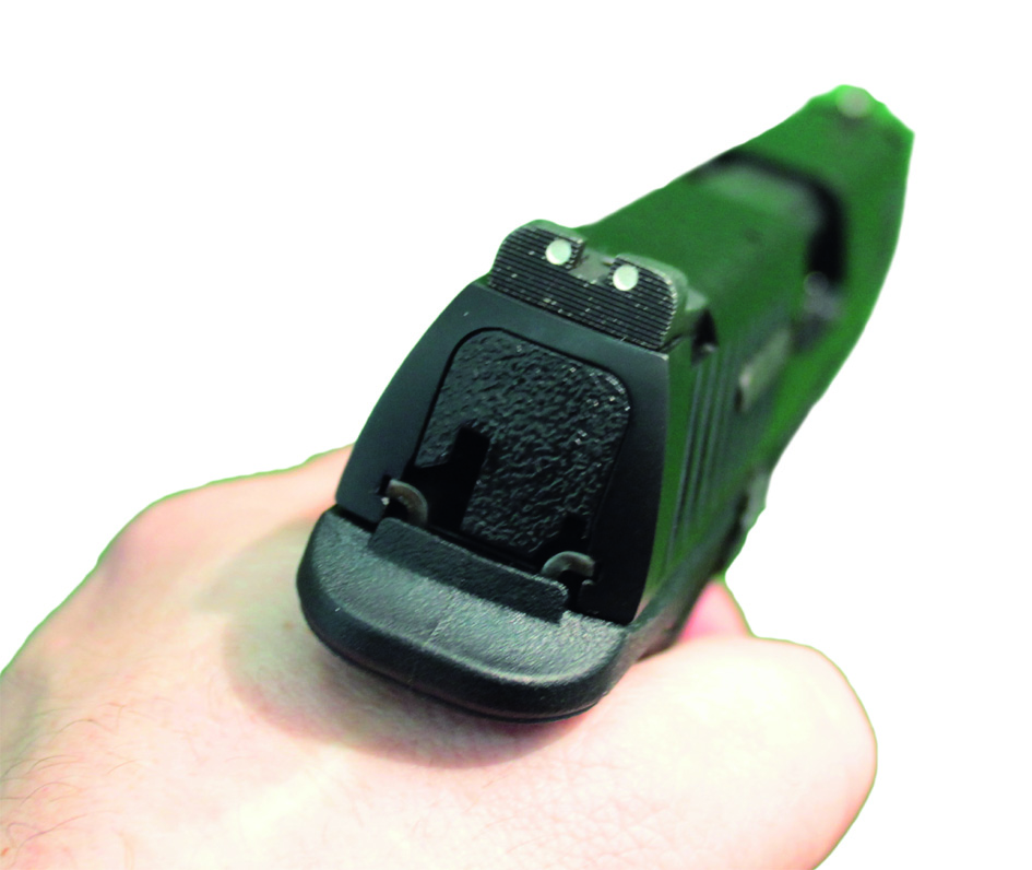 Takav utisak je dodatno pojačan posle rasklapanja oružja. Ram pištolja sa rukohvatom više podseća na airsoft modele nego na pravo oružje. Ali, idemo redom. Navlaka ima krupne ureze za repetiranje koji se nalaze i na prednjem delu koji je u zoni usta cevi sužen tako da olakša vraćanje oružja u futrolu. Snažan spoljašnji izvlakač služi i kao indikator metka u ležištu koji se može napipati u uslovima lošeg osvetljenja. Niski, široki borbeni nišani sa tri bele tačke daju veoma dobru sliku i metu je lako “zahvatiti” prvim pogledom duž gornje površine navlake. Kuriozitet je način obrade zadnjeg nišana koji ima “borbenu površinu”, šta god to značilo.