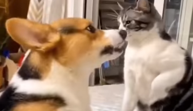 Na snimku je popularan Korgi kojeg doslovno maca bije po glavi, a on iako je duplo jači od nje, uživa u igri i dopušta joj da ga "bije".