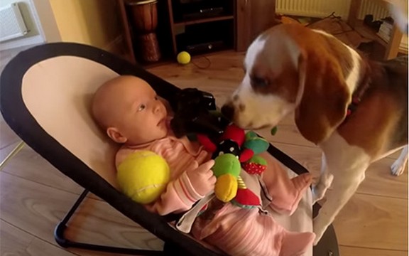 Ovaj pas spreman je na sve da uradi za bebu njegovih vlasnika. Iako joj je isprva ukrao igračku, posle se poprilično iskupio.