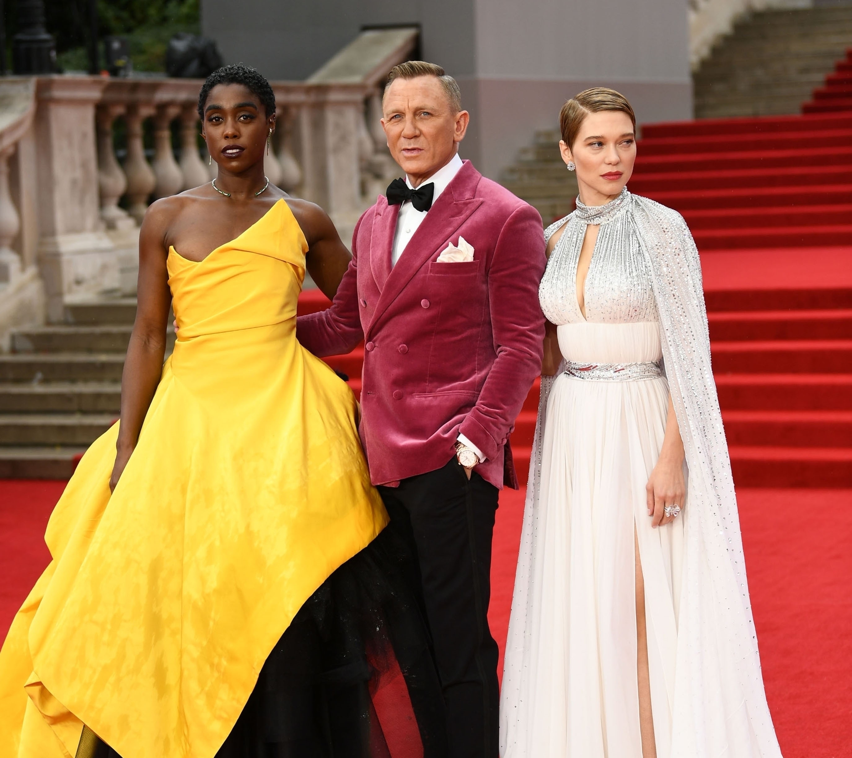 Danijel Krejg se na premijeri pojavio u roze somotskom sakou. Uz njega je nosio crne pantalone, košulju i kravatu.