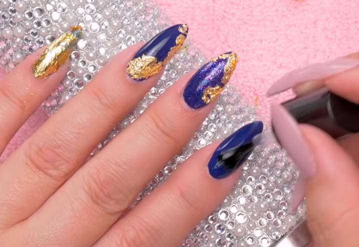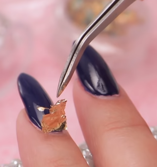 Daleko je zanimljivije kada se umesto preko celog, parče zlatnog listića nanese samo na delić nokta. Još bolji efekat se postiže sa parčetom izgužvanog zaltnog paprića.