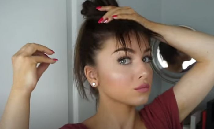 Vežite kosu u visok rep i od repa napravite punđu tako da pramenovi štrče oko gumice. Veći deo kose prebacite preko glave, kako bi šiške prekrile čelo. Vežite punđu još jednom gumicom, i pokupite pramenove koji su ostali.