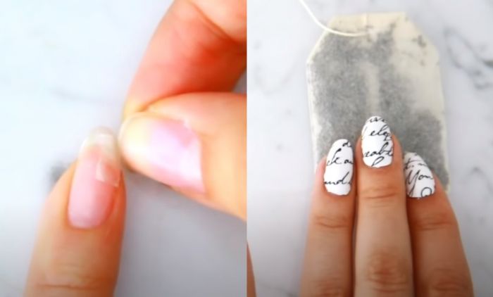 - Opcija: Umesto osnovnog sloja laka možete da koristite i lepak za nokte: naneti lepak na zacepljeni deo i na njega stavite komadić kesice čaja. Nanesite kap lepka na vrh.