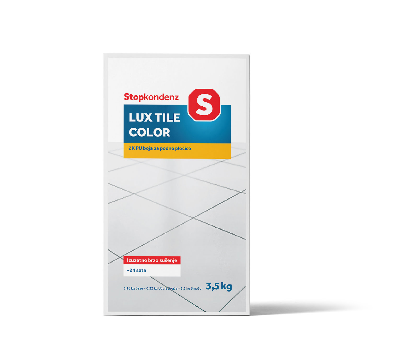 LUX TILE COLOR je visokokvalitetna dvokomponentna poliuretanska boja za podne i zidne pločice u enterijeru i eksterijeru. Univerzalno primenljiva na mnogobrojnim podlogama kao što su prevashodno pločice (zidne i podne), ali takođe i kade, tuš kade, beton, čelik, asfalt, drvo... Aplicirana boja se izuzetno brzo suši, pa se po površini može hodati već nakon 24 sata. Otporna je na sunčevu svetlost, dobro prijanja na pločice, ima vrlo nisku tendenciju prljanja, veoma dobru trajnost, otpornost, i visoku klasu otpornosti na klizanje.