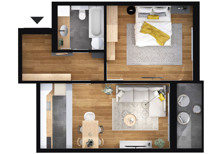 U primeru stana od 45m2, gde spavaća soba ima i prozor i balkonska vrata za terasu, zbog samog oblika prostorije i položaja kreveta bilo bi poželjno obezbediti dodatnu osvetljenost. Odlična podloga može biti zid u neutralnom sivom tonu.