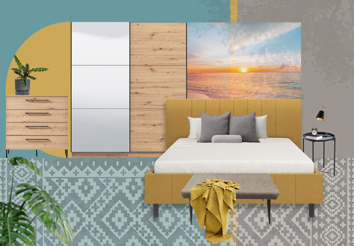 Kako biste sprečili da šarenilo zavlada ambijentom, predlog je podnožje ležaja dopunite trpezarijskom klupom B510 u sivoj nijansi, koja će se slagati i sa zidom iza ležaja. Dugi nogari klupe dorinose eleganciji prostora, naspram krupnijih komada nameštaja u ambijentu. Iz istog razloga umesto noćnog ormarića možete koristiti klub sto VKCT-50218 koji će se sjajno uklopiti uz crne detalje na komodi i garderoberu.