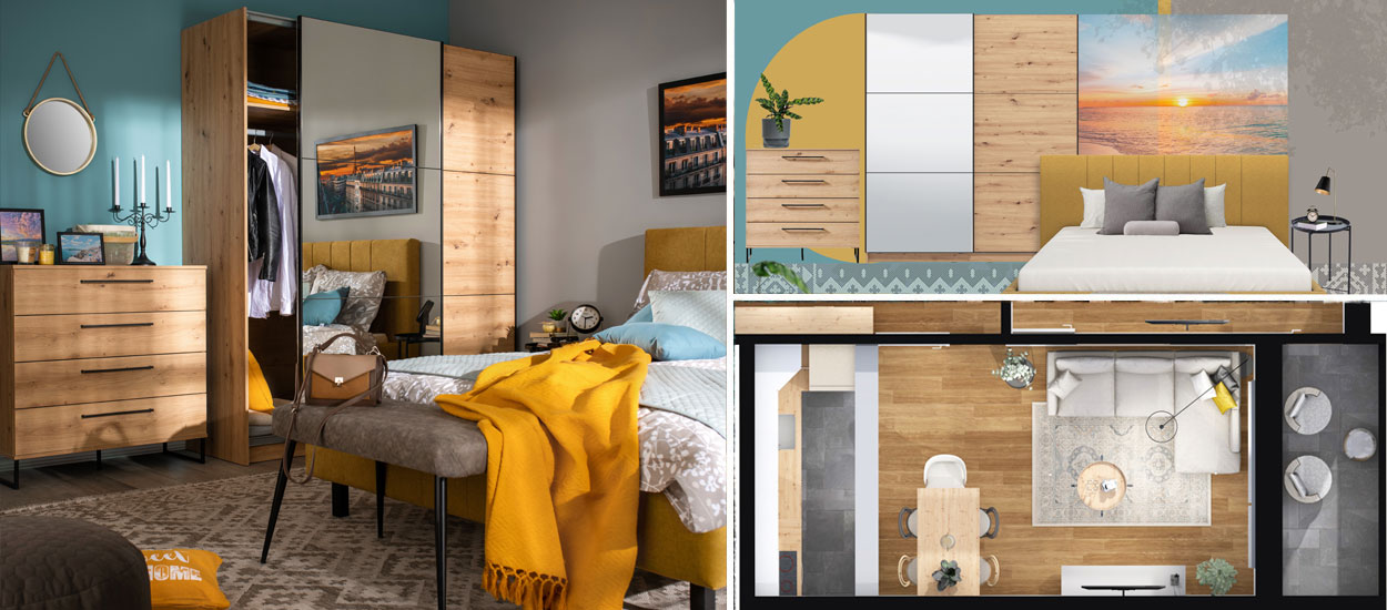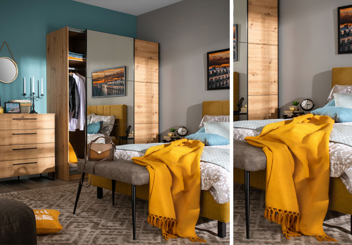 Za akcentni komad nameštaja možete izabrati garderober SIERRA 180 OG u dekoru artisan hrasta i savremenog dizajna, koji sa leve strane kliznog mehanizma ima i ogledalo. Uz njega se odlično uklapa komoda SARDINIA 4F, koja je spoj topline rustičnog artisan hrasta sa primesama suptilnih crnih elemenata dekora, a njenoj funkcionalnosti doprinose i četiri fioke u koje možete smestiti razne stvari. Kontast u ambijentu i dodatno naglašavanje komada nameštaja možete postići krečenjem zida iza ovih elemenata u svetloplavu nebo nijansu.