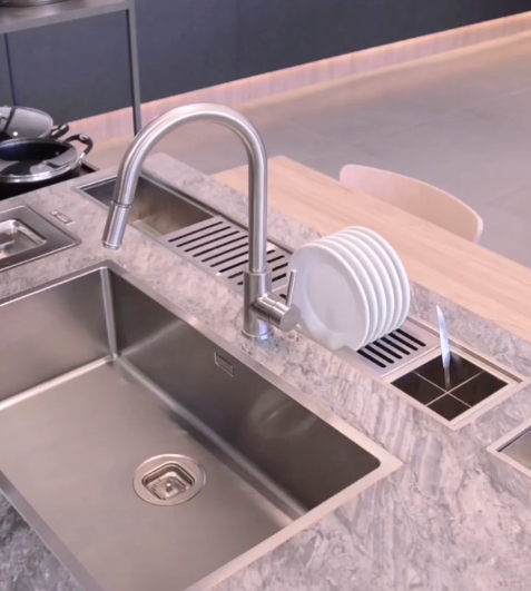 Naime, iza same sudopere možete da ugradite udubenje koje je direktno povezano sa odvodom sudopere, na koje ćete staviti jednostavne rešetke sa sušenje sudova. Na ovaj način ćete moći da se otarasite plastičnih sušilica za sudove, koje svi imamo u domu, i na kojima se svakodnevno skupljaju bakterije, koje prouzrokuju i neprijatne mirise.