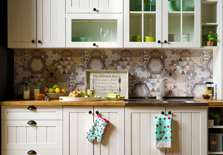 Dizajn staklenih frontova za rustičnu kuhinju često uključuje dekorativne lajsne koje doprinose rustičnom šarmu. Odabirom modernih šestougaonih pločica sa šarom unećete dodatno osveženje u ambijent.