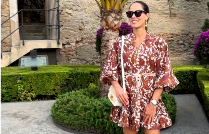 Ana je svoje duge vitke noge stavila u prvi plan, u kratkoj lepršavoj haljini zanimljivog desena braon-belih tonova.