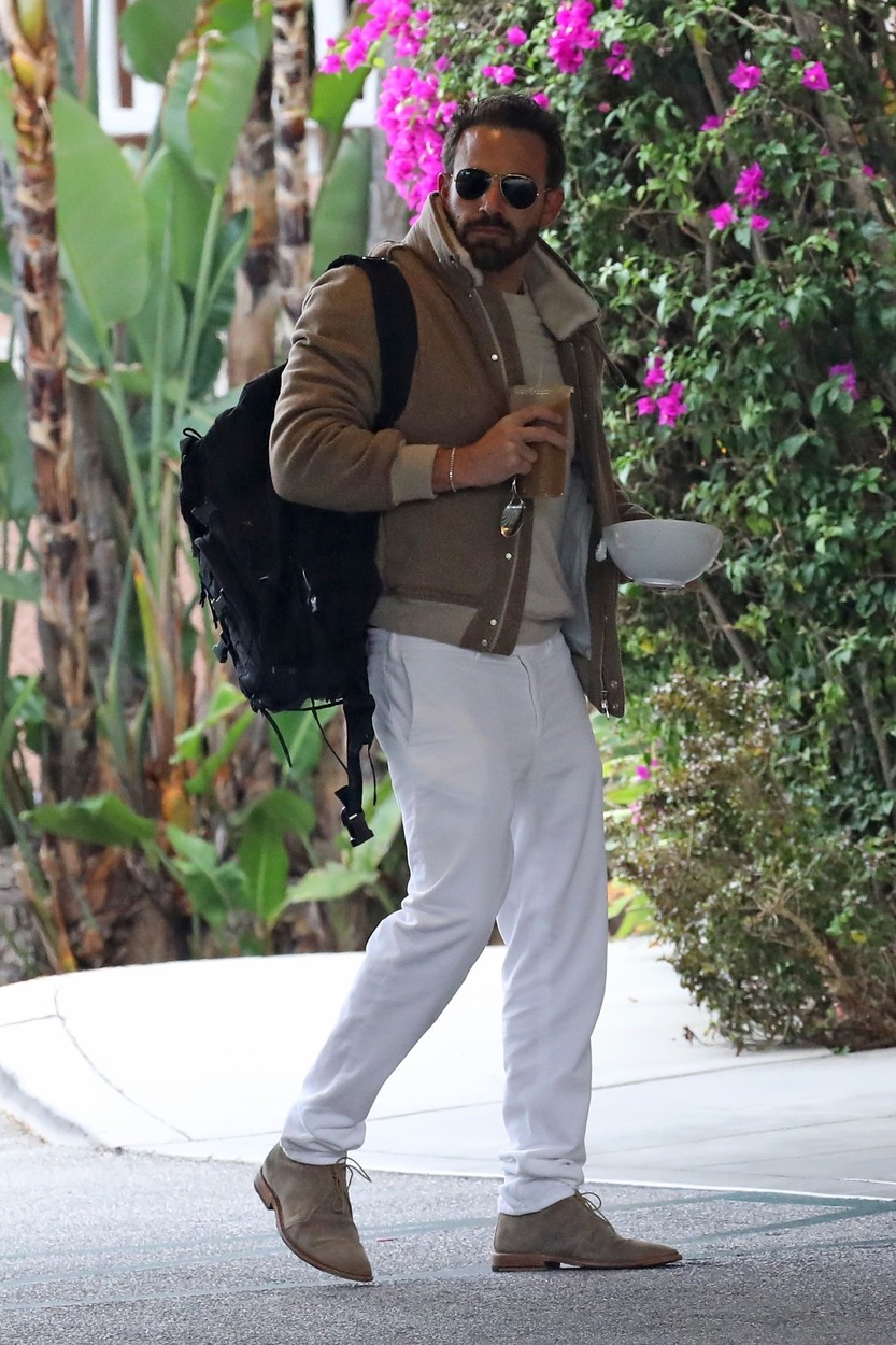 Ben (50) izgledao je uglađeno u belim pantalonama, džemperu i žutosmeđoj jakni.