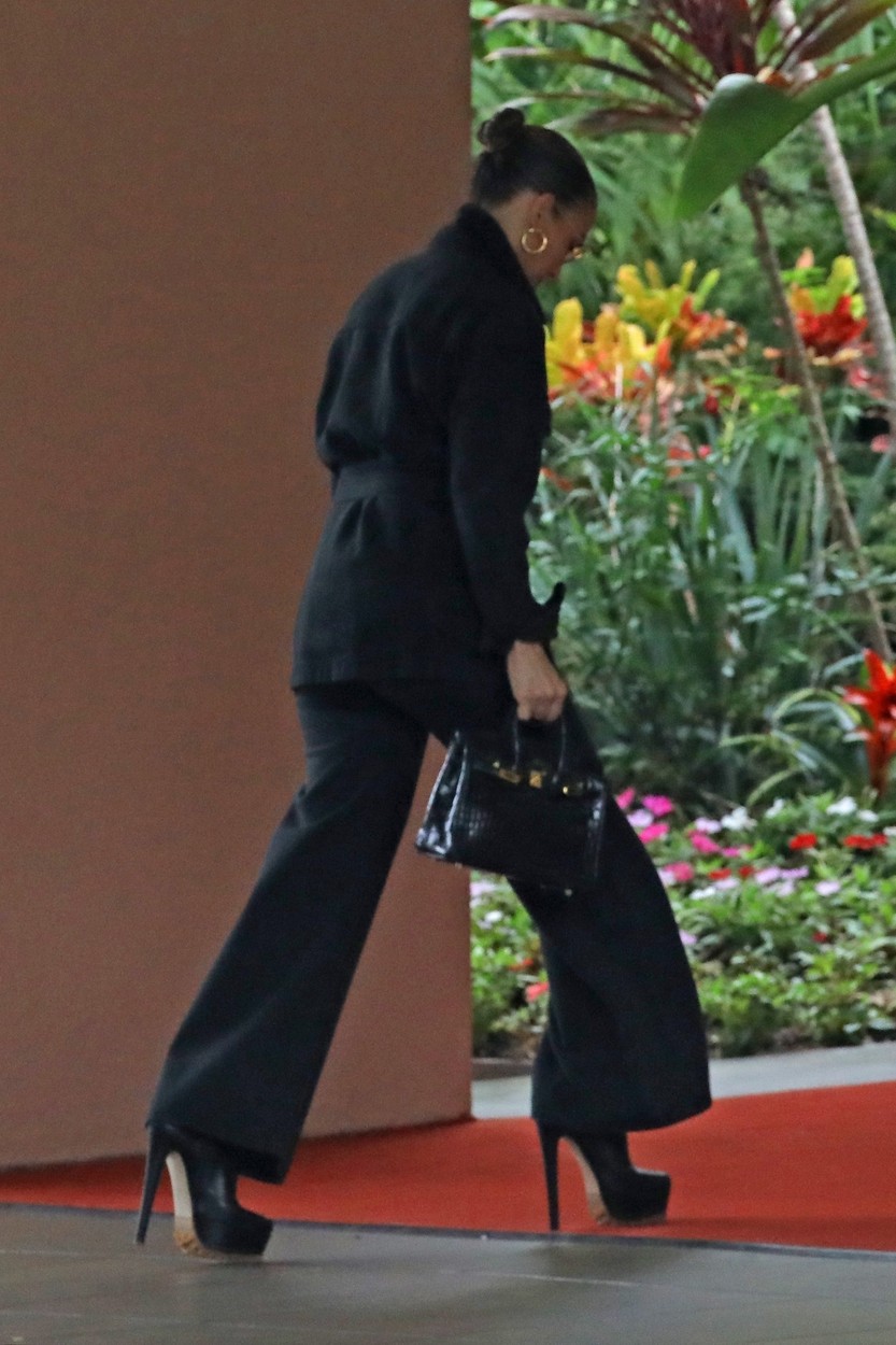 Dženifer izgleda potpuno spremno za jesen u crnom odelu. Nosi neprolazne pantalone širokih nogavica i sako sa kaišem. Kosu je skupila u viosku zalizanu punđu dok ne odustaje od visokih potpetica ni početkom dana.