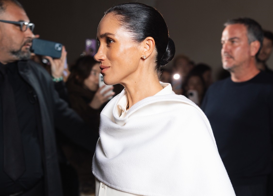 Megan je za ovu priliku odabrala monohromatsku belu kombinaciju koja je savršeno naglasila njen minimalistički, ali luksuzan stil. Nosila je oversized beli kaput, košulju sa dugmadima i široke pantalone u istoj nijansi, koje je uparila sa crnim salonkama na špic i diskretnim nakitom.