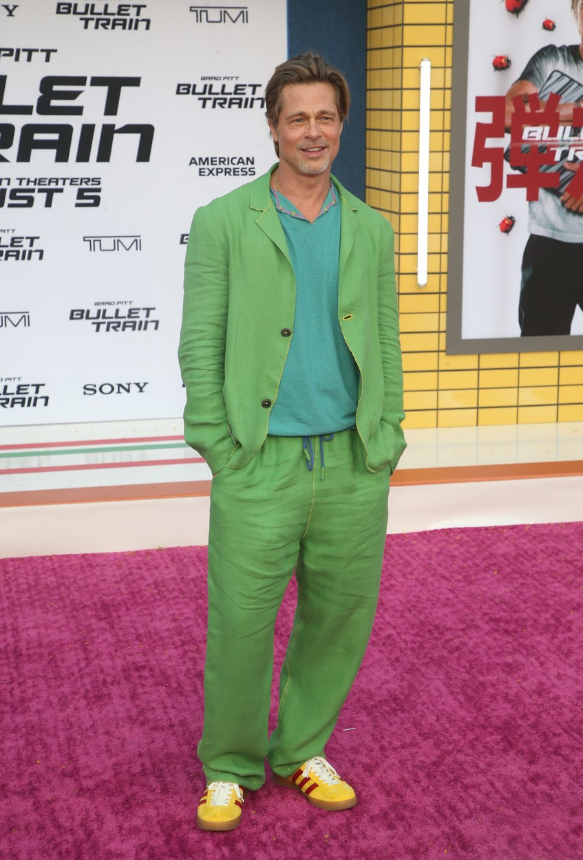 Bred Pit, pojavio se na premijeri filma"Bullet Train", u svetlozelenom odelu od lana, a ispod sako imao je tirkiznu majicu sa kragnom.