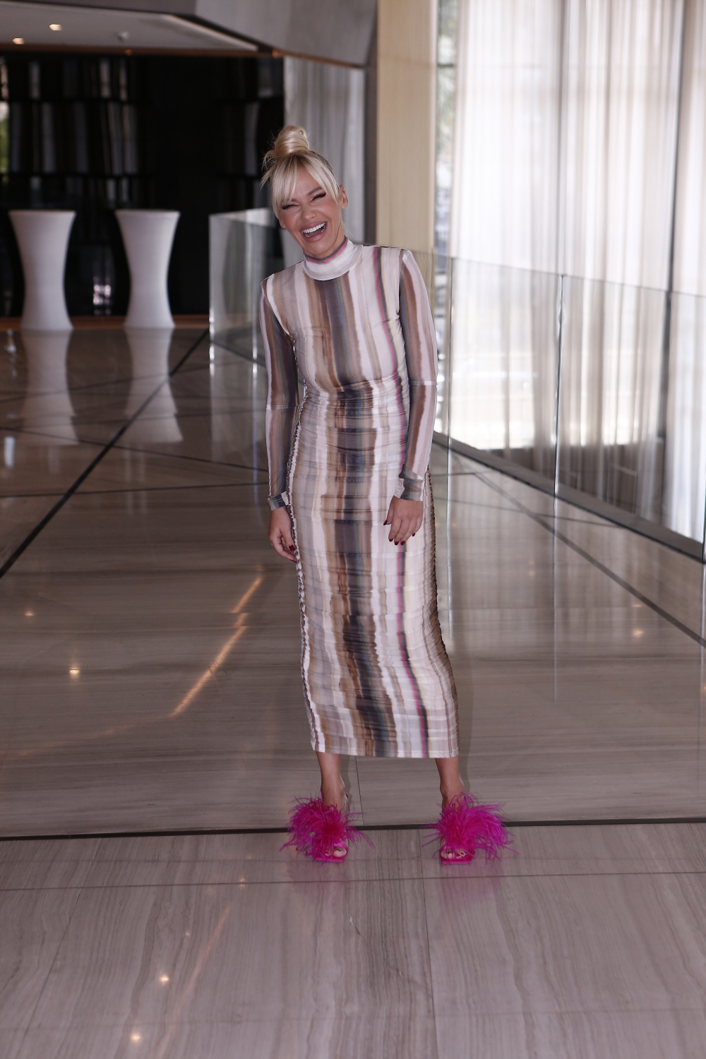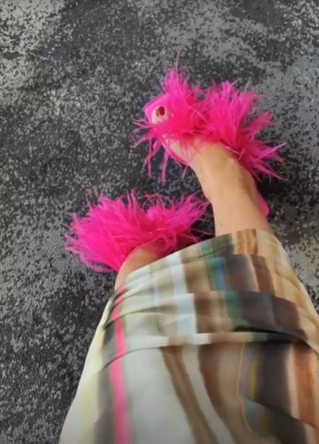 Nosila je drečavo roze papuče sa perjem, koje je ukombinovala sa dugom haljinom. Ona je na ebi imla pruge različitih nijansi od braon, preko narandžaste, do bež i bele boje. Procenite sami da li vam je ova kombinacija potpuni pogodak ili je Nata ovog puta ipak malo preterala i spojila nespojivo.